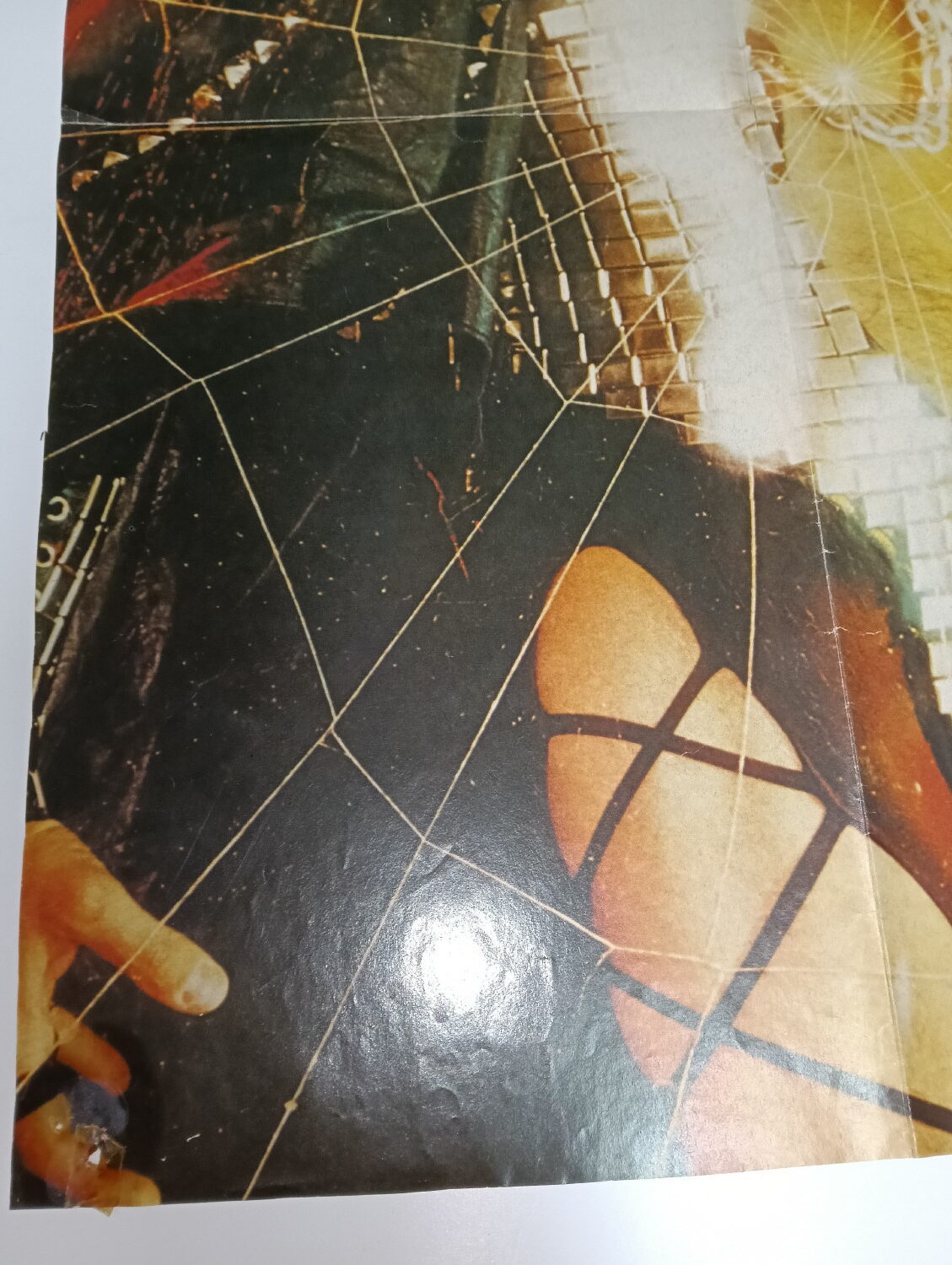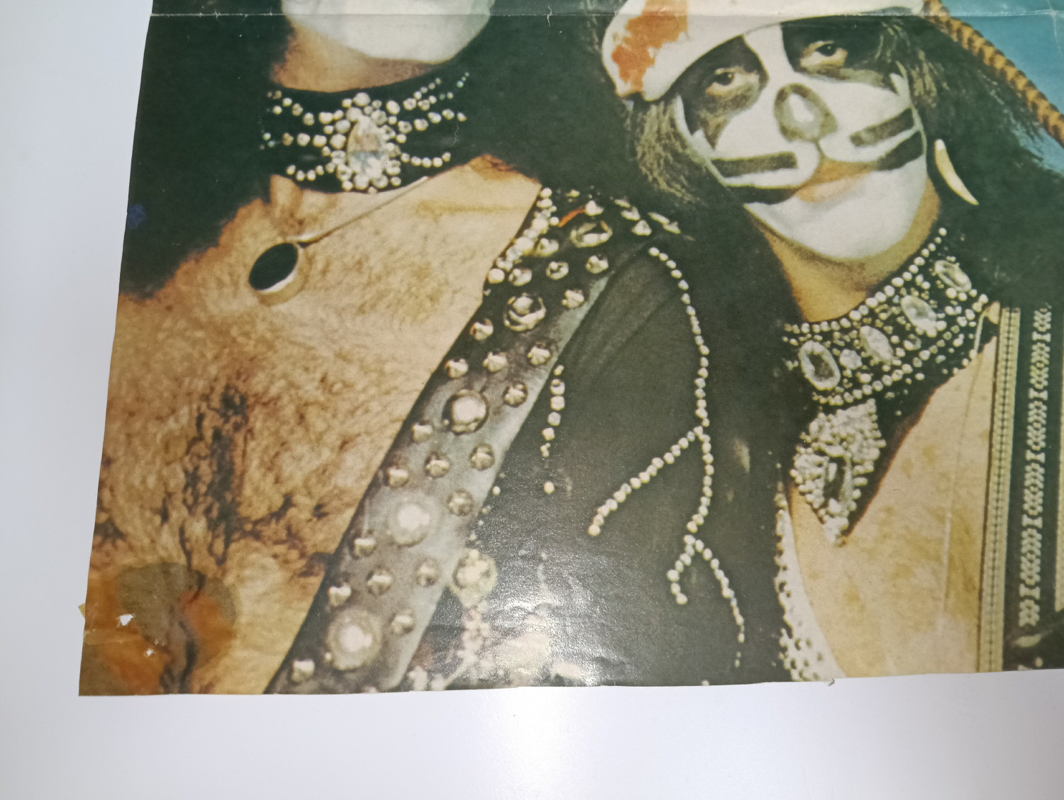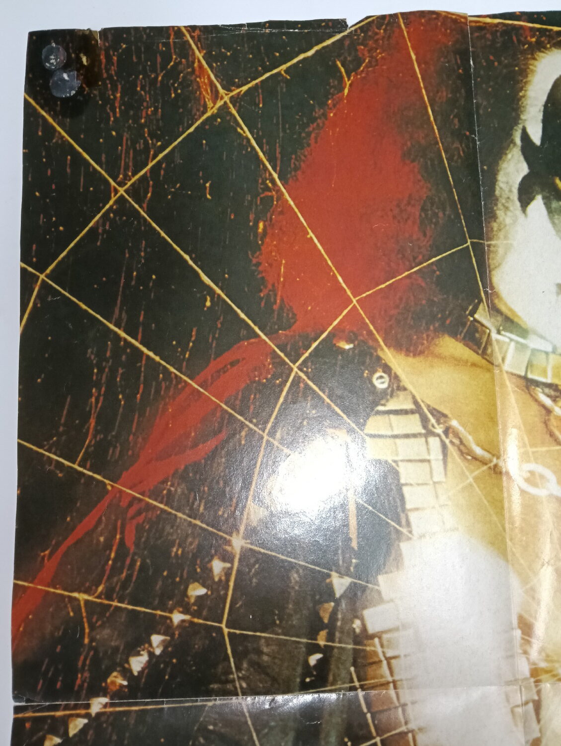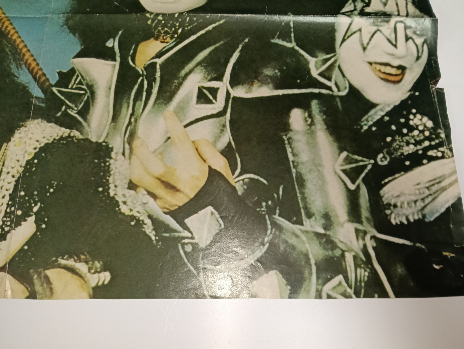 Magazine-posters – especially vintage ones – were often used to hang on a wall and many had just normal thin paper. So these could have tag-holes, adhesive tape residue, stains, tears, rips, seam splits, holes from the staples of the magazines, etc.