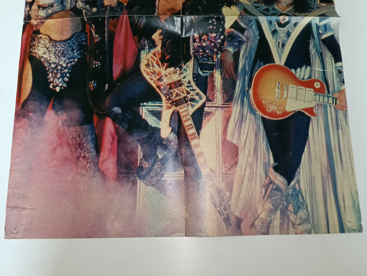 Magazine-posters – especially vintage ones – were often used to hang on a wall and many had just normal thin paper. So these could have tag-holes, adhesive tape residue, stains, tears, rips, seam splits, holes from the staples of the magazines, etc.