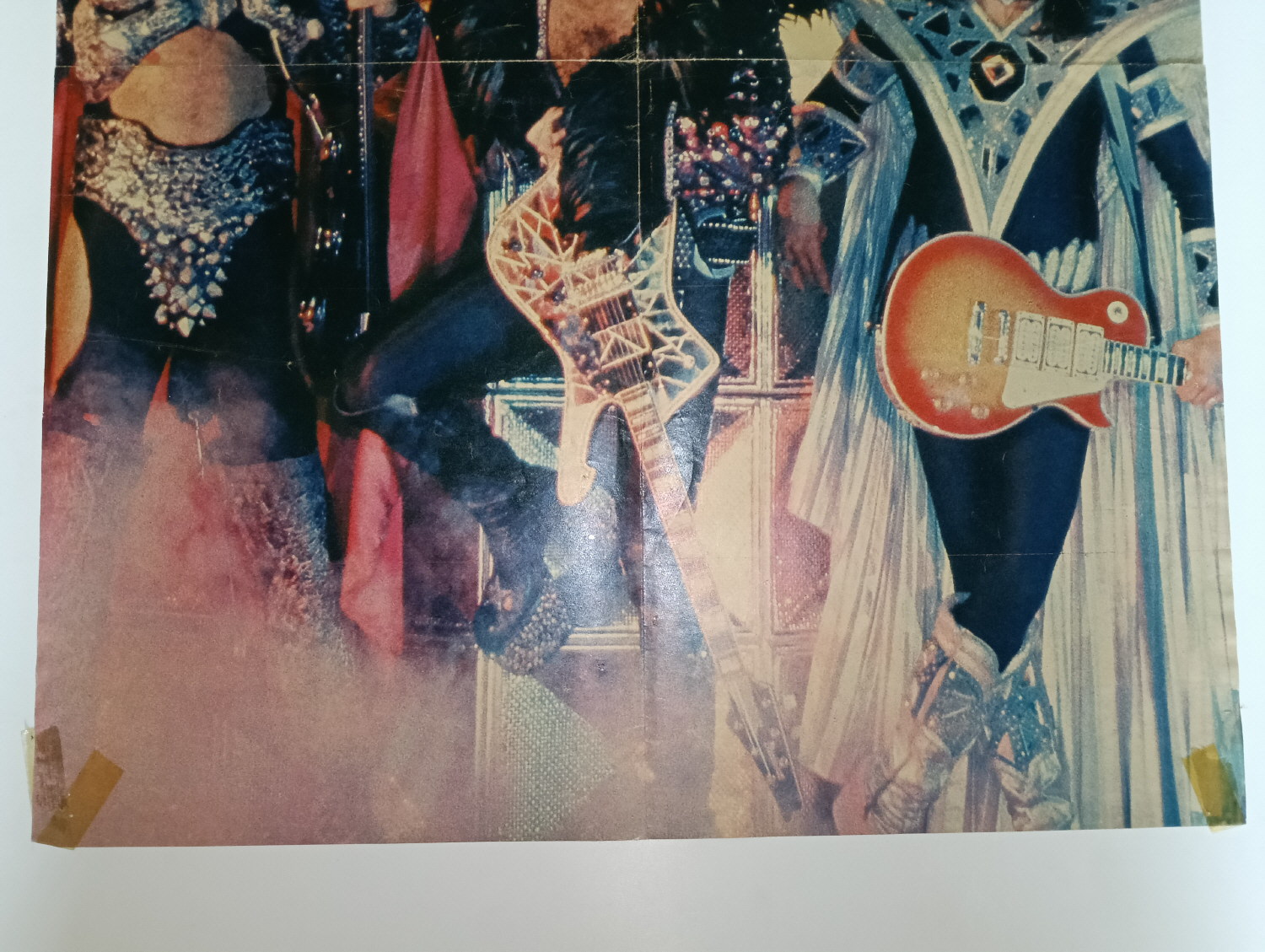 Magazine-posters – especially vintage ones – were often used to hang on a wall and many had just normal thin paper. So these could have tag-holes, adhesive tape residue, stains, tears, rips, seam splits, holes from the staples of the magazines, etc.