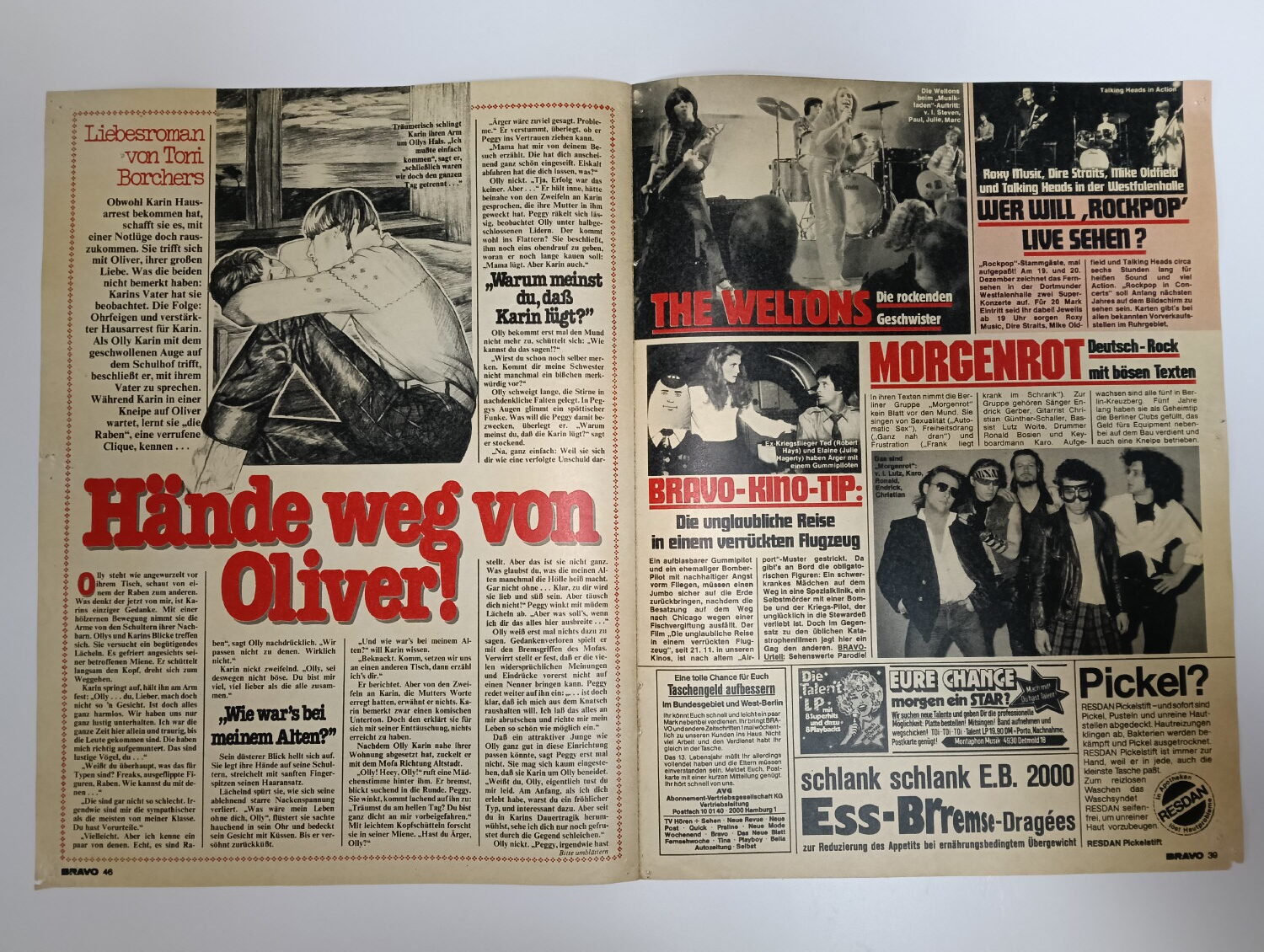 Magazine-posters – especially vintage ones – were often used to hang on a wall and many had just normal thin paper. So these could have tag-holes, adhesive tape residue, stains, tears, rips, seam splits, holes from the staples of the magazines, etc.