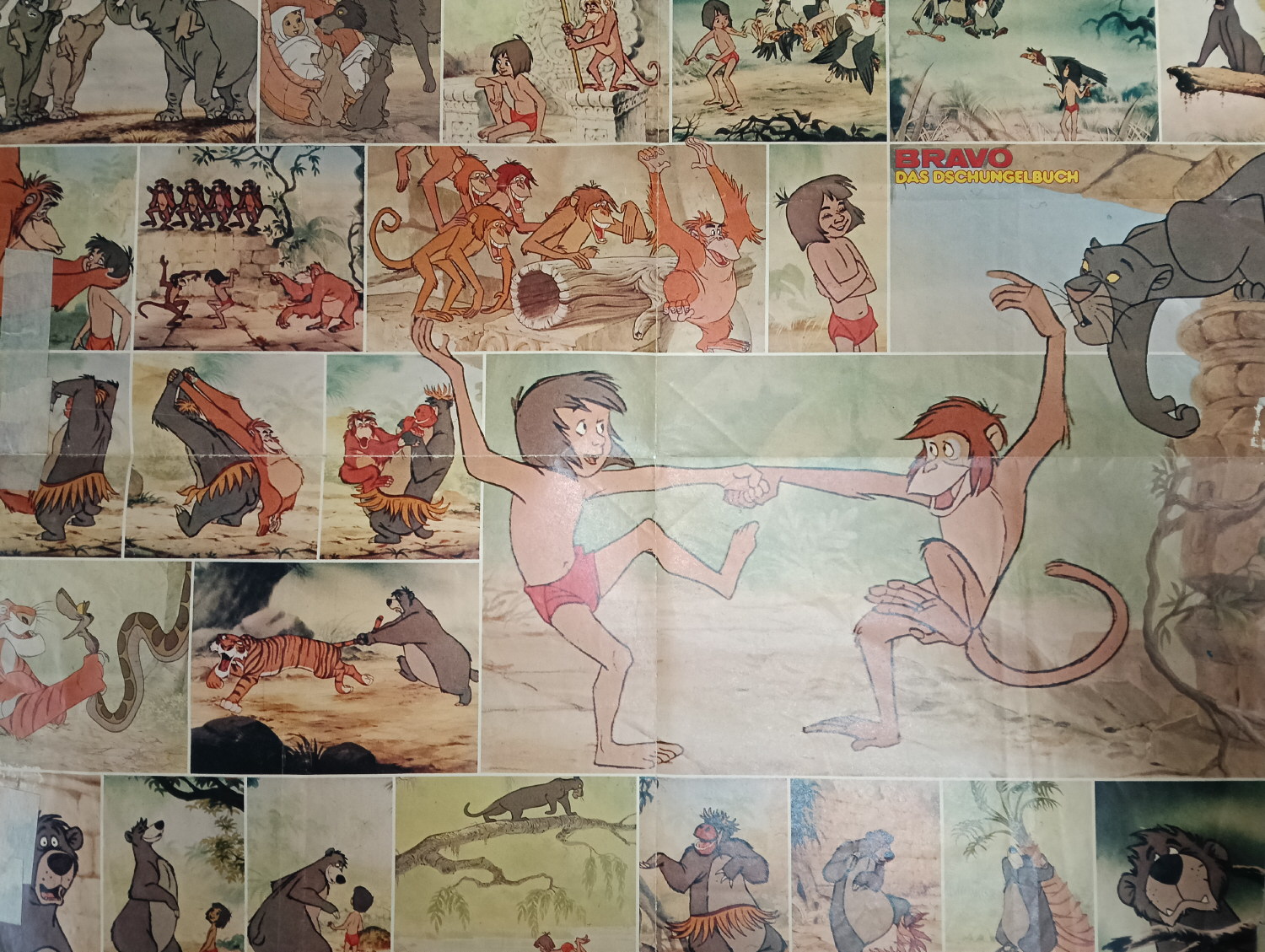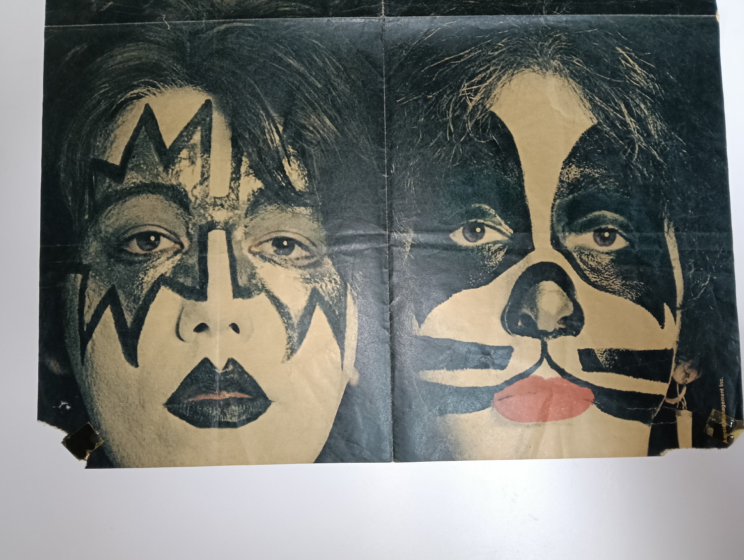 Magazine-posters – especially vintage ones – were often used to hang on a wall and many had just normal thin paper. So these could have tag-holes, adhesive tape residue, stains, tears, rips, seam splits, holes from the staples of the magazines, etc.