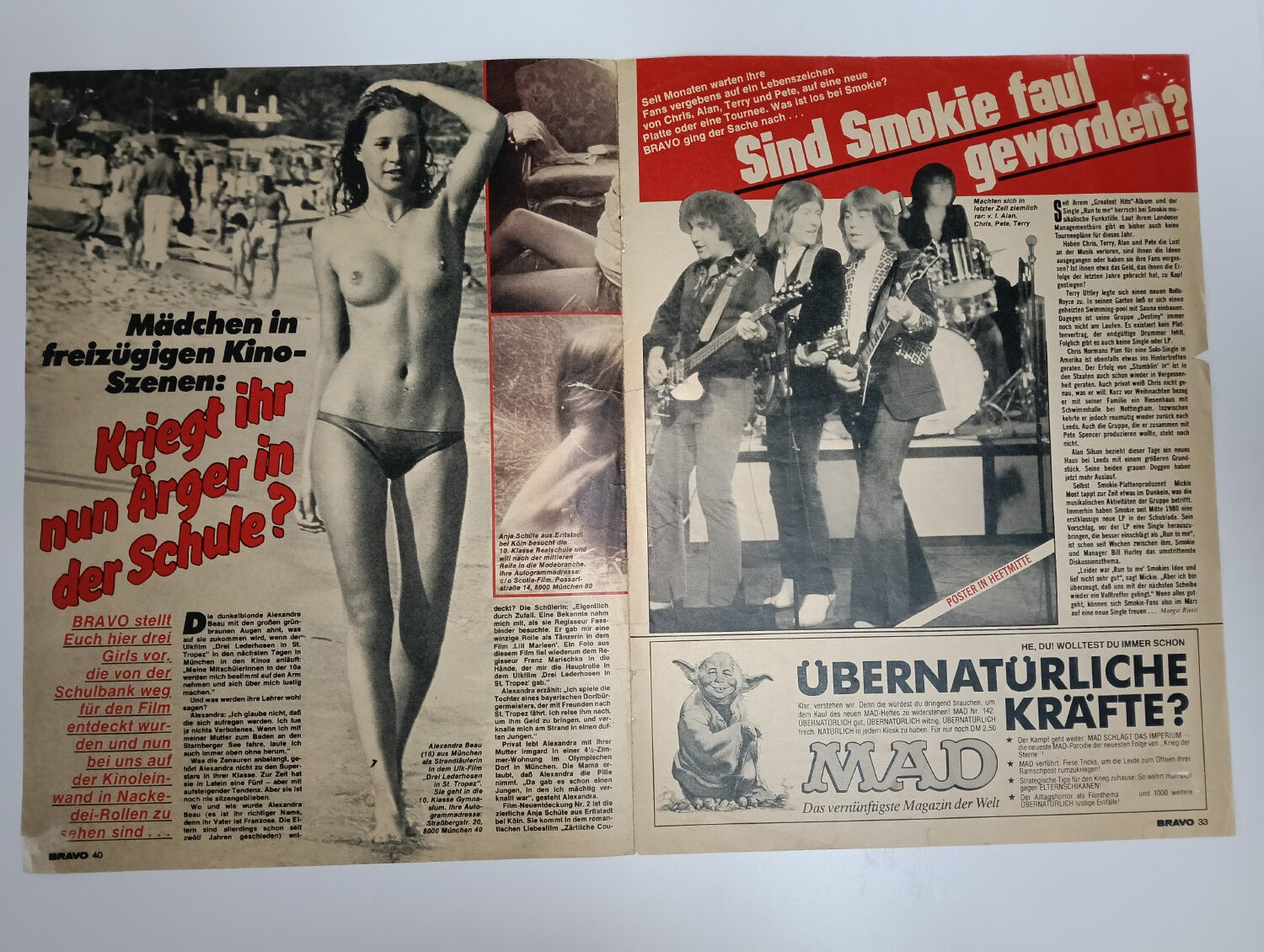 Magazine-posters – especially vintage ones – were often used to hang on a wall and many had just normal thin paper. So these could have tag-holes, adhesive tape residue, stains, tears, rips, seam splits, holes from the staples of the magazines, etc.