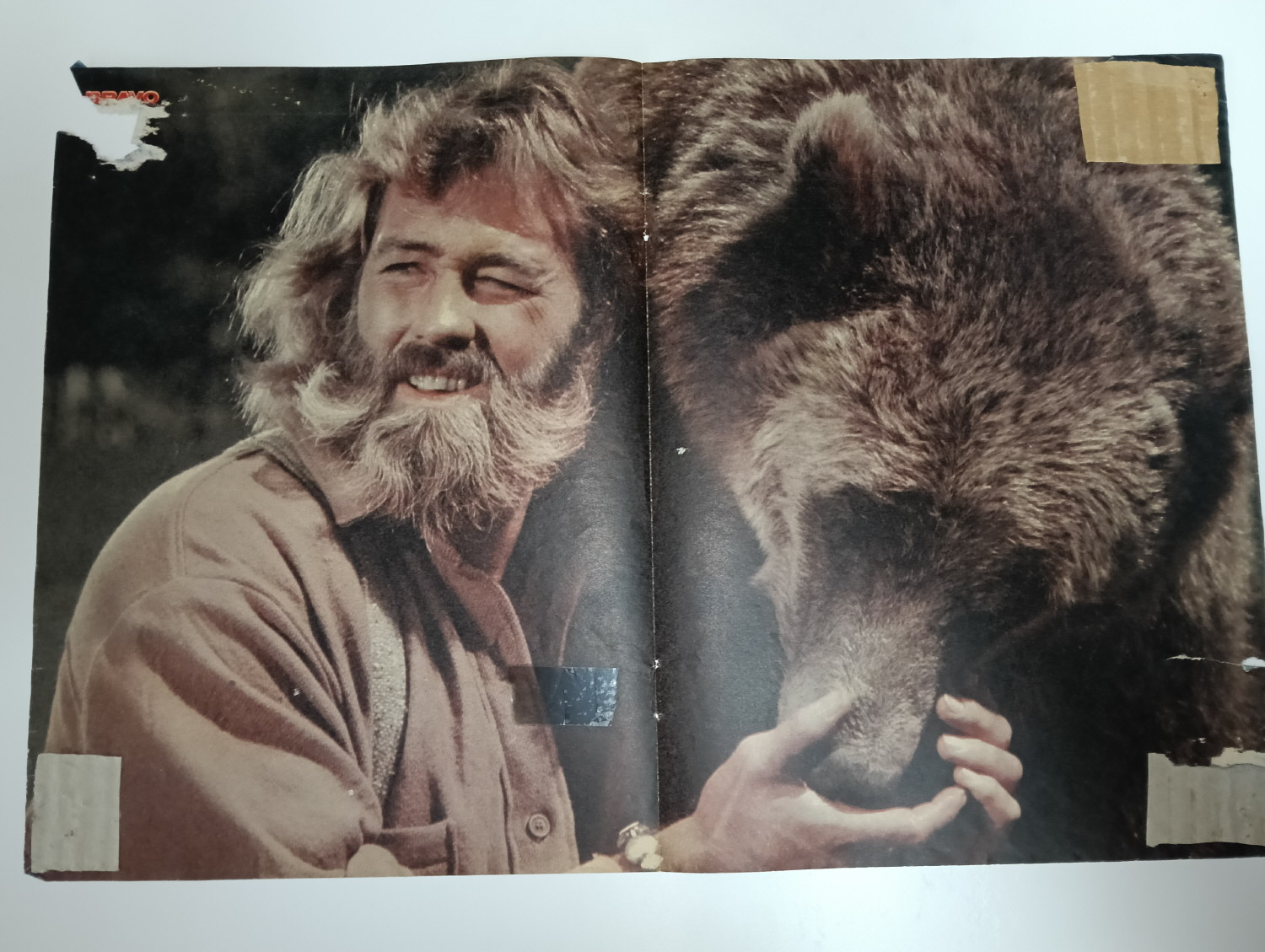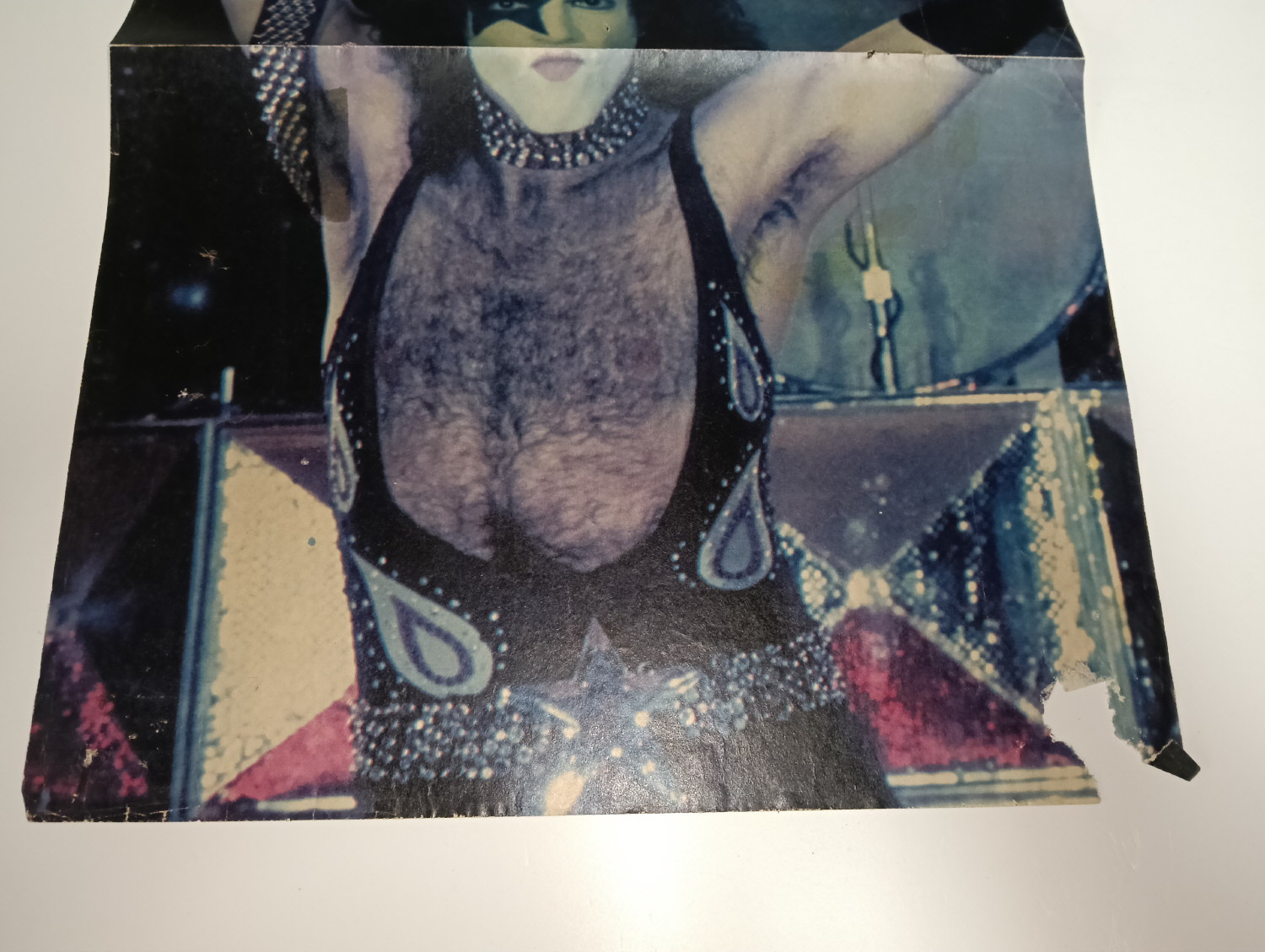 Magazine-posters – especially vintage ones – were often used to hang on a wall and many had just normal thin paper. So these could have tag-holes, adhesive tape residue, stains, tears, rips, seam splits, holes from the staples of the magazines, etc.