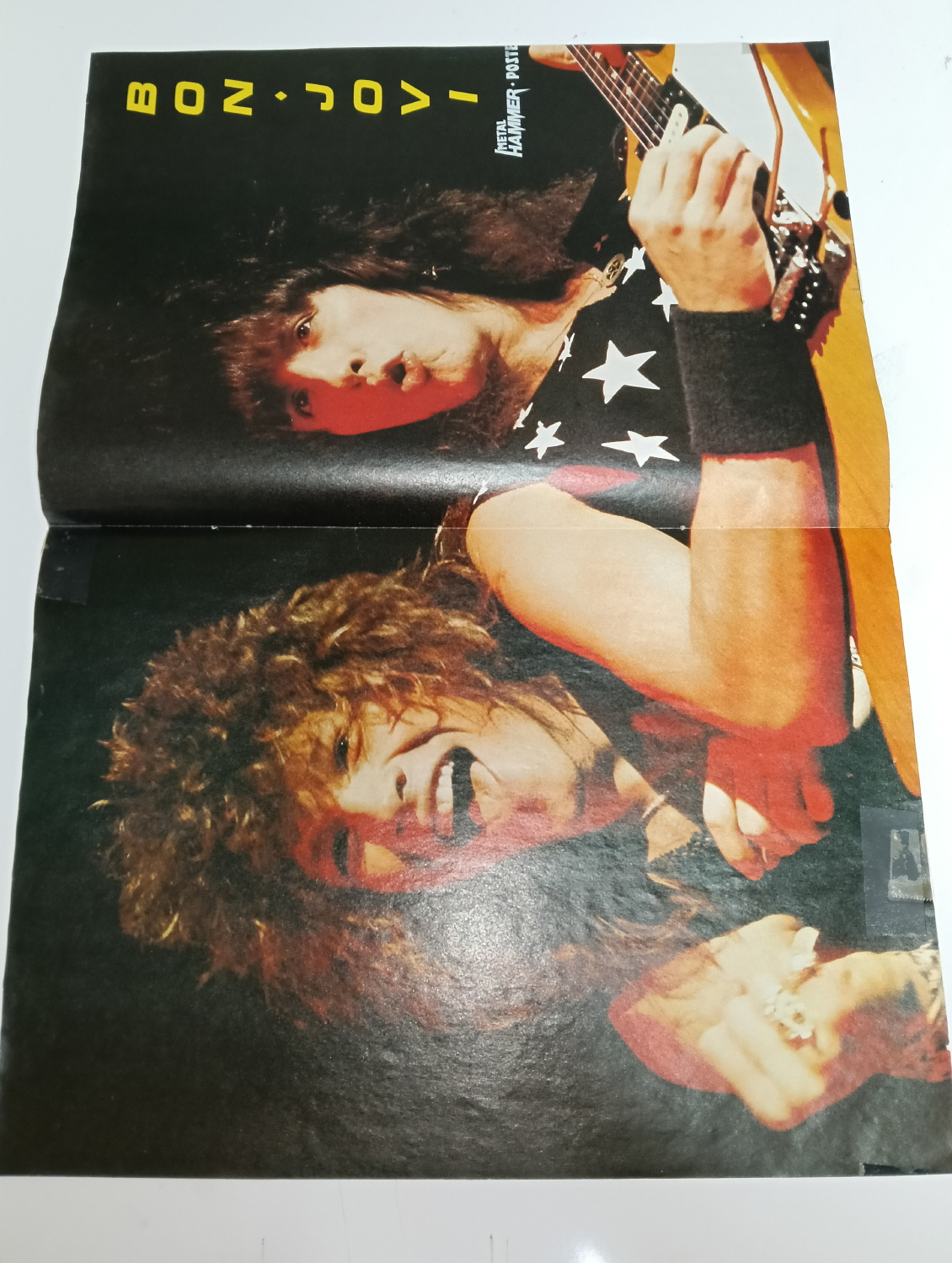Magazine-posters – especially vintage ones – were often used to hang on a wall and many had just normal thin paper. So these could have tag-holes, adhesive tape residue, stains, tears, rips, seam splits, holes from the staples of the magazines, etc.