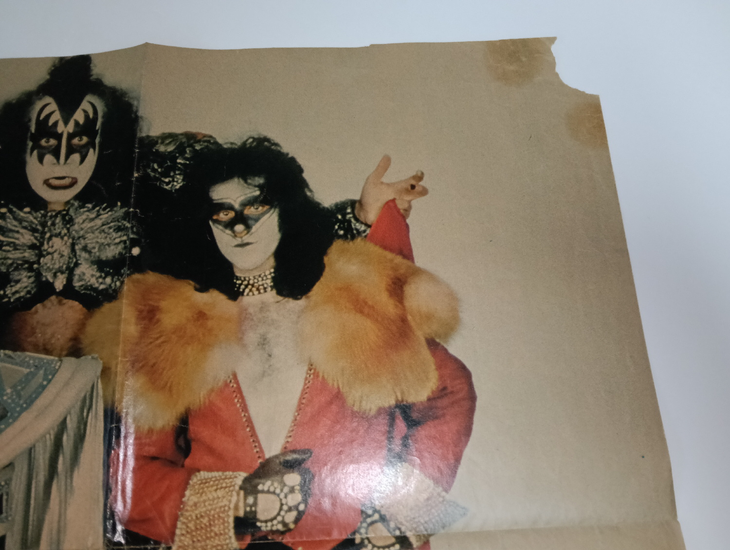 Magazine-posters – especially vintage ones – were often used to hang on a wall and many had just normal thin paper. So these could have tag-holes, adhesive tape residue, stains, tears, rips, seam splits, holes from the staples of the magazines, etc.