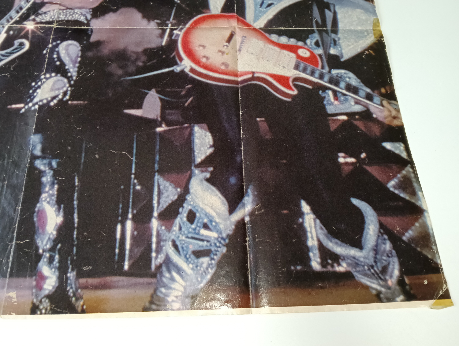 Magazine-posters – especially vintage ones – were often used to hang on a wall and many had just normal thin paper. So these could have tag-holes, adhesive tape residue, stains, tears, rips, seam splits, holes from the staples of the magazines, etc.