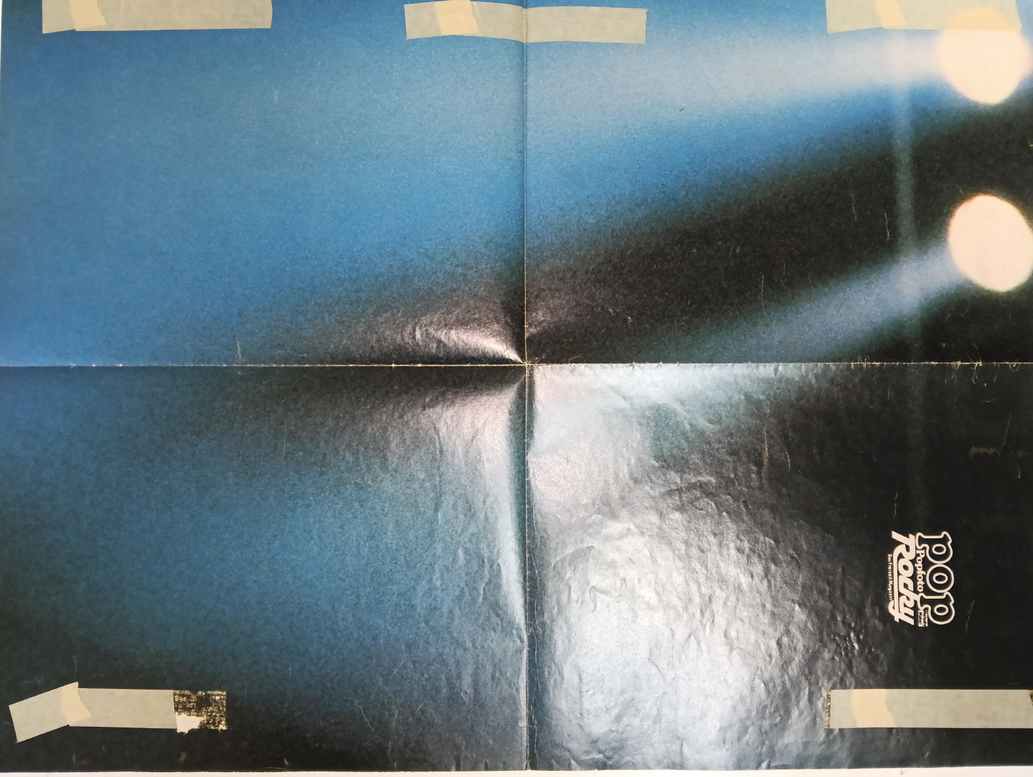 Magazine-posters – especially vintage ones – were often used to hang on a wall and many had just normal thin paper. So these could have tag-holes, adhesive tape residue, stains, tears, rips, seam splits, holes from the staples of the magazines, etc.
