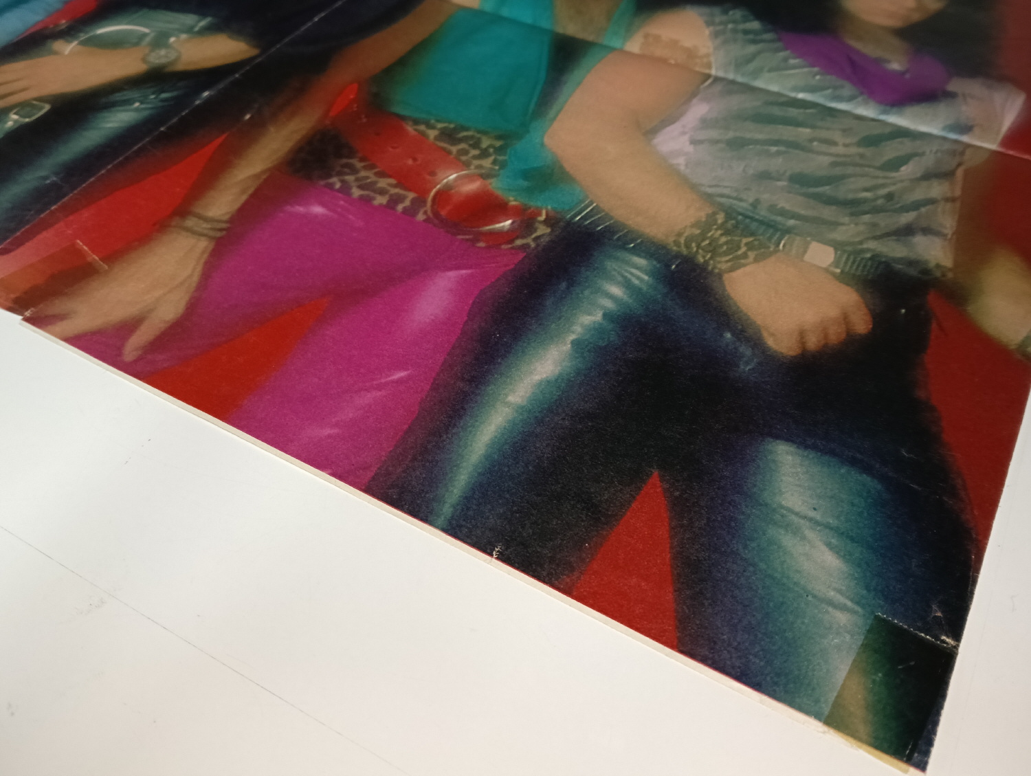Magazine-posters – especially vintage ones – were often used to hang on a wall and many had just normal thin paper. So these could have tag-holes, adhesive tape residue, stains, tears, rips, seam splits, holes from the staples of the magazines, etc.