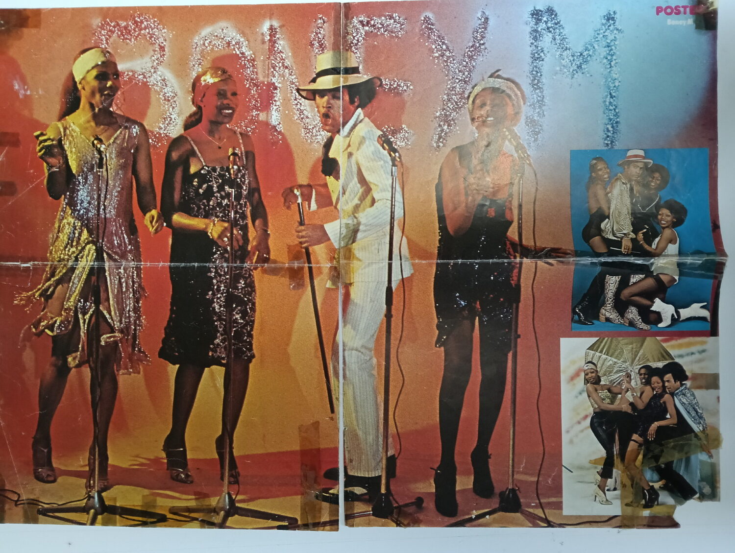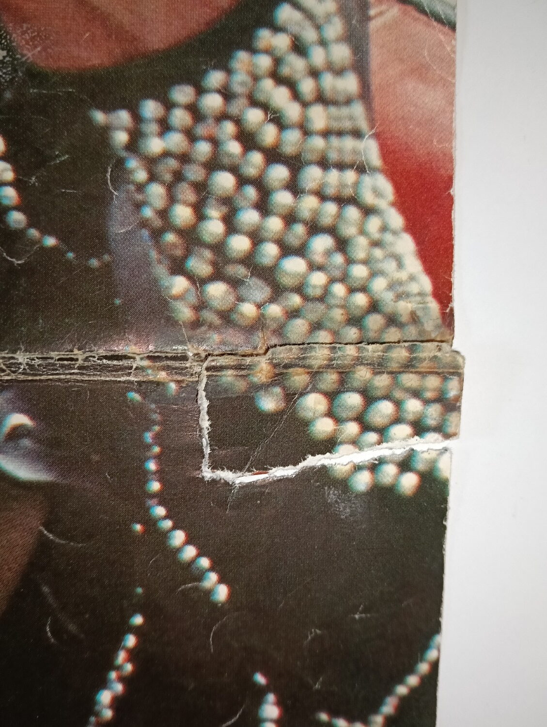 Magazine-posters – especially vintage ones – were often used to hang on a wall and many had just normal thin paper. So these could have tag-holes, adhesive tape residue, stains, tears, rips, seam splits, holes from the staples of the magazines, etc.