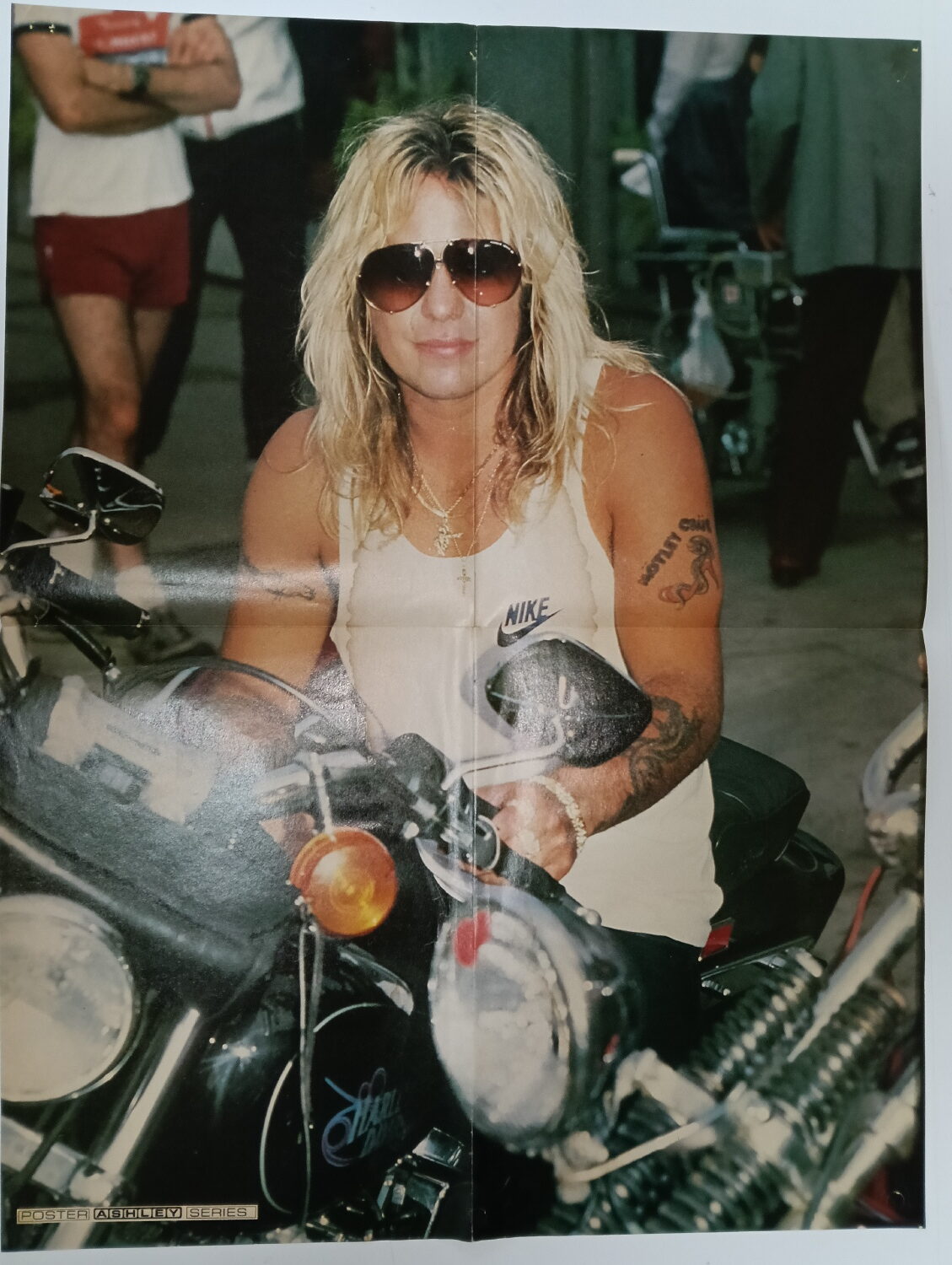 Magazine-posters – especially vintage ones – were often used to hang on a wall and many had just normal thin paper. So these could have tag-holes, adhesive tape residue, stains, tears, rips, seam splits, holes from the staples of the magazines, etc.
