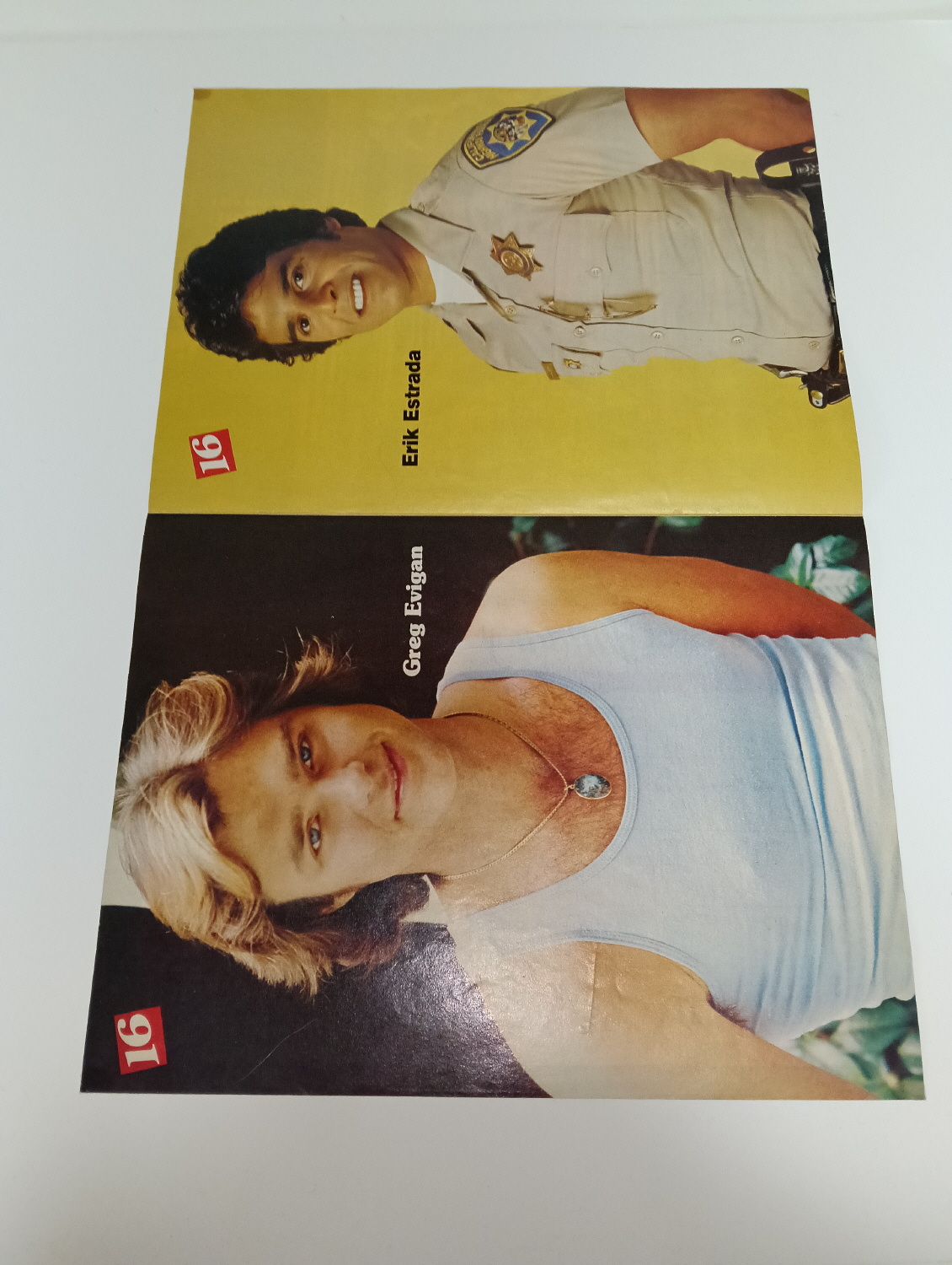 Magazine-posters – especially vintage ones – were often used to hang on a wall and many had just normal thin paper. So these could have tag-holes, adhesive tape residue, stains, tears, rips, seam splits, holes from the staples of the magazines, etc.